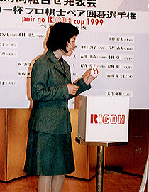 もっとも、初の体験で緊張気味のレドモンド八段。「囲碁界のオールスターゲームにふさわしい大会」と口火を切ったが、どことなくぎこちない司会ぶりが会場を和ませる。 吉国一郎・日本ペア囲碁協会会長、浜田広・リコー代表取締役会長のあいさつのあと、さっそく組み合わせの抽選に入った。 出場者は16組32人。タイトル保持者や勝率上位者で選ばれた精鋭ばかりで、この日は半数以上の棋士が顔をそろえた。ある男性棋士は「せっかくのペアだから、自分の手で相手を決めたい」と出席した理由を話す。実はこの抽選会、想像以上にプレッシャーのかかるくじ引きなのだ。 抽選方法は、AからPまで書かれたボールを2組用意し、女性用・男性用の箱にそれぞれ入れる。出場者が自分でボールを取り、枠に名前を書き込んでいく。欠席者は、吉国会長や浜田会長ら関係者が代理で引くことになった。ボールを引いて、まだ相手の決まってないHの枠に入った小林泉美女流棋聖は、席に戻るやいなや、「この抽選、緊張するんですよね」と小声で漏らす。「そうなのよ。こんなに緊張する抽選はほかにはないわね」と相槌を入れたのは小林千寿五段だった。 |