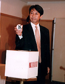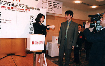 リコー杯プロ棋士ペア囲碁選手権1999の組み合わせ抽選会は10月27日、東京・飯田橋のホテルエドモントで開かれた。毎年、華のある抽選会として、出場棋士が楽しみにする、ちょっとしたイベントになりつつある。 五回目を迎えた今回、司会にマイケル・レドモンド八段が起用された。司会といえば白江治彦七段らベテランの顔が何人か浮かぶ。しかし事務局によると、新しい人材を育てる意味もあるのだとか。日本語の微妙なニュアンスをそのまま理解して、独特のユーモアで切り返しができる唯一の米国棋士だ。うまくいけば、意外な才能が花開くかもしれない。 |