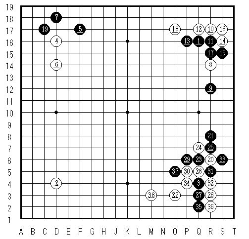 | 黒37までは右辺の幅がよく、黒が打ちやすい。白26では27、黒31、白26の定石を採るべきだった。 |