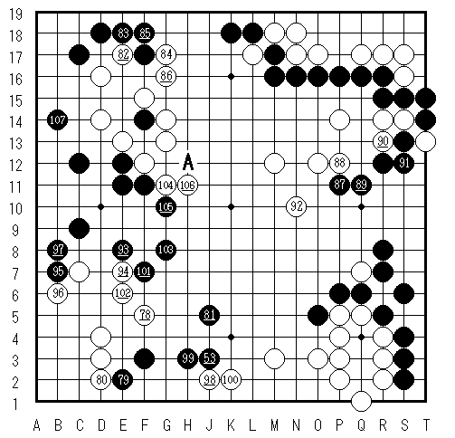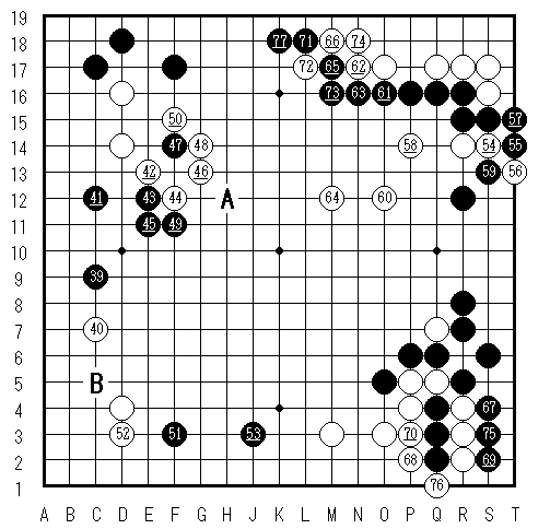 | 黒47に白48の反発も問題。黒49に白50がやむをえず、黒にAの好点を残した。 以降優勢を意識してか、所どころに黒の緩着が目立つ。黒59はすぐに61、63と押していいし、黒77も打つなら119にアテてからツイでいたい。それより、黒77はBを決行する最後のチャンスだった。Bは取られる石ではないし、無理に取りに来れば自然と外側を強化できる。 |